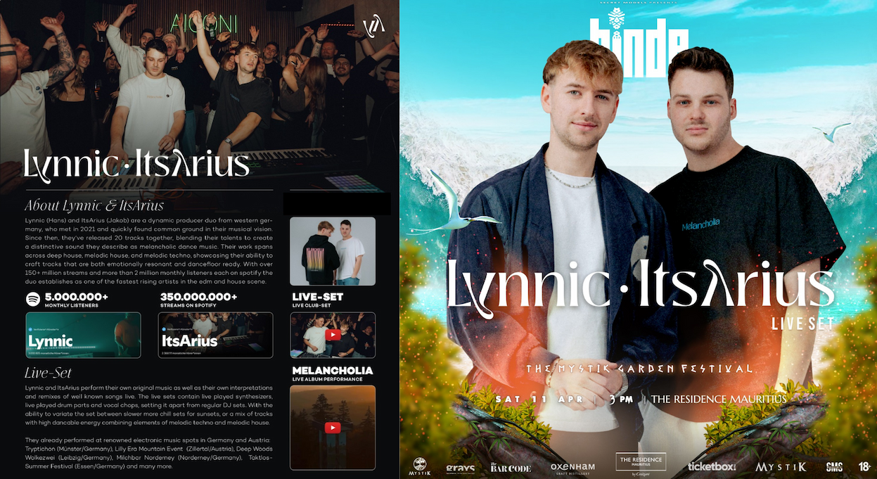 In addition of having the legendary afro-house superstar, Mystik brings for the first time the dynamic duo producers from western germany - Lynnic & itsArius . They will be joining legendary @nitefreakdj for the exclusive most-awaited Hinde Showcase in April as lead supporting acts. Their work spans across deep house, melodic house, and melodic techno, showcasing their ability to craft tracks that are both emotionally resonant and dancefloor ready. With over 150+ million streams and more than 2 million monthly listeners each on Spotify the duo establishes as one of the fastest rising artists in the edm and house scene.